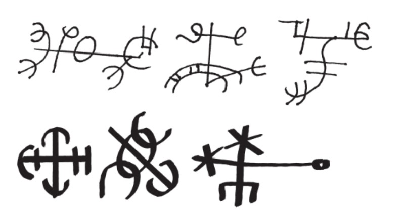 Tal y como prometimos, vamos a mostrar algunos galdrastafir famosos y repetidos en los manuscritos, pero que no pueden identificarse simplemente por los patrones de formas circulares y formas rectas que hemos visto en los casos previos. Casualmente, ninguno de los bastones rúnicos que no son ni círculos ni rectas tienen significados protectores o de fortuna, sino que están diseñados con fines especializados y muy concretos. Veamos algunos modelos: